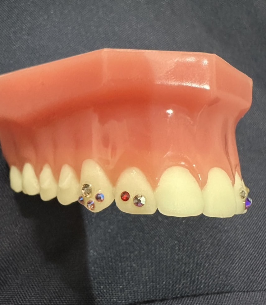 トゥースジュエリーとは、歯の表面に、カラフルなジュエリーを装着する施術で、日本でも芸能人や若者に人気の施術となっています。